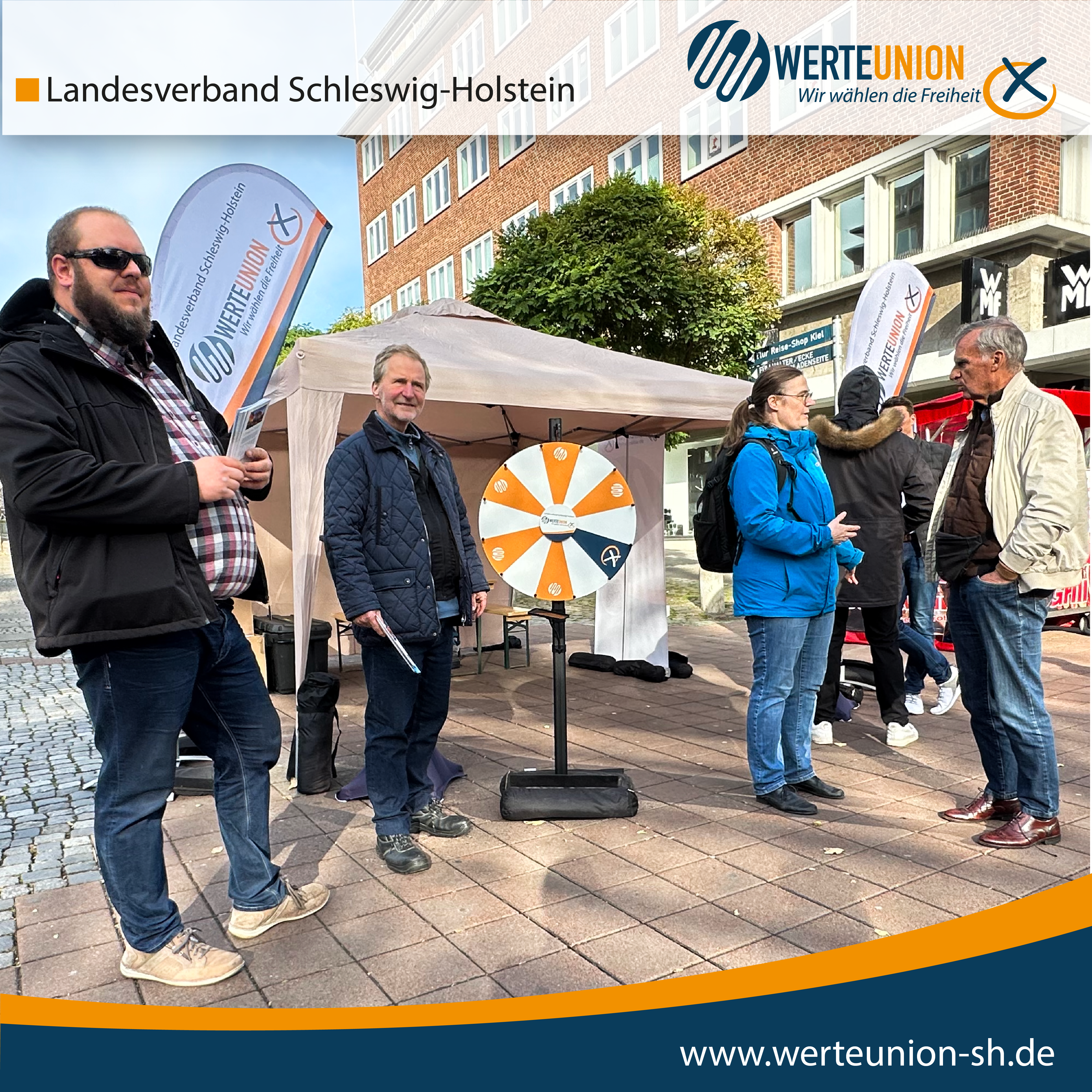Bei sonnigem Wetter haben wir am 12.10.24 an unserem Infostand an der Schevenbrücke Kiel (Holstenstraße) die WerteUnion-Partei zahlreichen interessierten Bürgern näher gebracht. Steffen Schröter, Dr. Bruno Hollnagel, Eicke Kuhlnagel, Nico Röhrs und Martin Fröber haben spannende und angeregte Gespräche geführt. Besonders unsere jungen, zukünftigen Wähler konnten wir mit unserem WU-Glücksrad begeistern. Neben Tassen, Stiften und Süßigkeiten konnten wir auch viele unserer Programflyer an Passanten verteilen. Insgesamt ein erfolgreicher Tag für die Freiheit!
